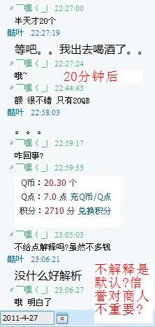 接着他用个借口说离开一下。有过之前的交易记录所以没在意这个。再加上时常有人喊喇叭顶他信誉。可惜时间过了QB还是没到账(不知道为什么,会给我了20个。)看下他回答的话,我跟他说是不是该解释一下。他既然说,没什么解释的,很明显,他到手了不想再多说。信誉对1个商人来说多重要,这个不说你也明白。