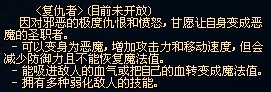 堕落天使之镰、恶毒之镰、镇魂之镰、死神之镰、异灵之镰、献祭之镰、猎魂之镰、暗王之镰、罪恶之斩首镰、酒神之战镰、末日浩劫之镰、圣光战镰;50级紫镰刀名叫复仇者之镰。复仇者的护甲可能是布甲,因为有一件20级的布甲上衣“初级修行者长袍”加一级恶魔之手。
