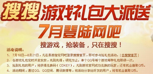 1、 7月18日—8月21日,凡在易游指定网吧登录搜搜首页,即可参与抢礼包活动。[ 去搜搜首页 ]