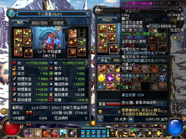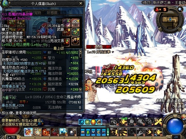 因为镰刀是附魔35力量的所以我拿图腾的时候就带了白虎称号面板相差了409点物功,无视都是791,以下截图的都是经过上10次以上截图所抓取到的最高伤害,有暴击效果的伤害。