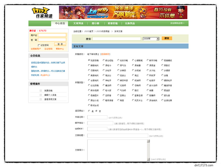投稿初级筛选群:QQ群号:133064171 (加群注明 17173DNF文章投稿) 成功投稿后可以进入高级投稿群。