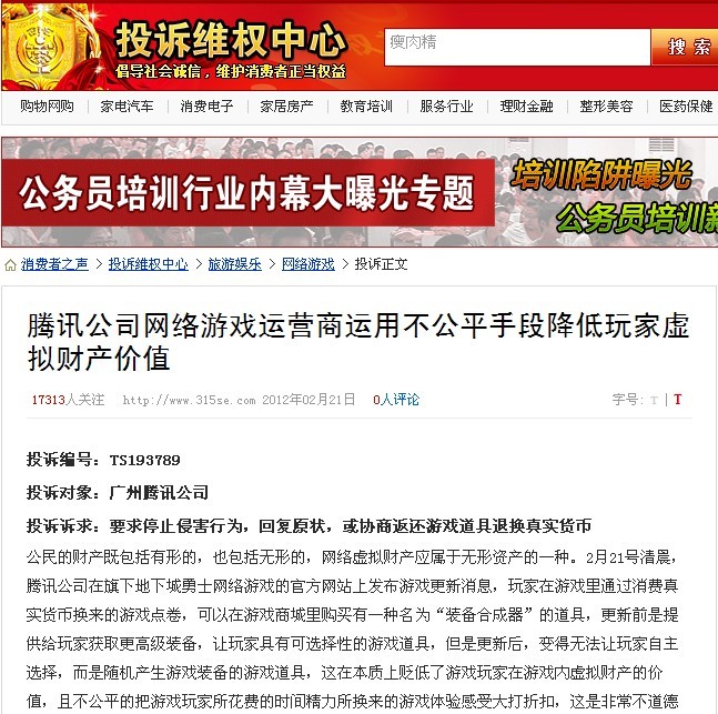 先介绍一个法律概念,公民的财产既包括有形的,也包括无形的,网络虚拟财产应属于无形资产的一种。2月21号清晨,腾讯公司在旗下地下城勇士网络游戏的官方网站上发布游戏更新消息,玩家在游戏里通过消费真实货币换来的游戏点卷,可以在游戏商城里购买有一种名为“装备合成器”的道具,更新前是提供给玩家获取更高级装备,让玩家具有可选择性的游戏道具,但是更新后,变得无法让玩家自主选择,而是随机产生游戏装备的游戏道具,这在本质上贬低了游戏玩家在游戏内虚拟财产的价值,且不公平的把游戏玩家所花费的时间精力所换来的游戏体验感受大打折扣,这是非常不道德和不够诚信的,游戏运营商腾讯公司在2012-02-20 20:43:46 公布了相关的更新信息,但是在2012年2月21日(周二)5:30-9:00更新了相关内容,从本质上运营商此举是想麻痹广大玩家,在游戏内采取突击更新,让玩家无法及时预见自身的财产贬值风险。