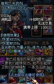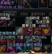 英雄秘方,如同他的名字,是只有英雄才能使用的药水,听说莎兰那里有许多的这种药水,不过想要获得就难了,在西海岸的东边,有一座死亡之塔,只有通过那里,获得死神对你的认可,莎兰才会将此物品交给你,如此难以获得的物品的效果当然也是强大的,在200S内力量与智力各加60,差不多等于全程了,如果是这个,当然还不够,接下来再看看他的冷却吧!