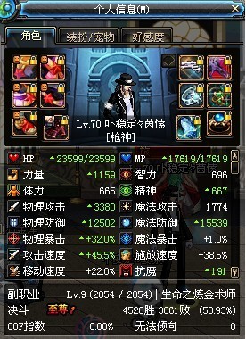首先附上装备属性图。满级。无黑钻。无契约。反正什么都没。装备是天五。MJ是补丁改的。