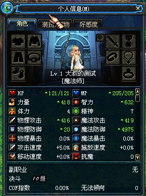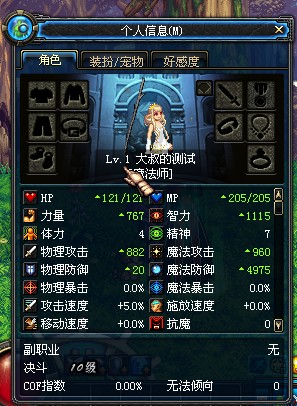 裸体60属性公会,无觉醒,力量414,智力625,面板物攻403,面板魔攻408。