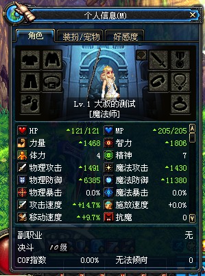 全装备60属性公会,无觉醒,力量763,智力1108,面板物攻869,面板魔攻949。