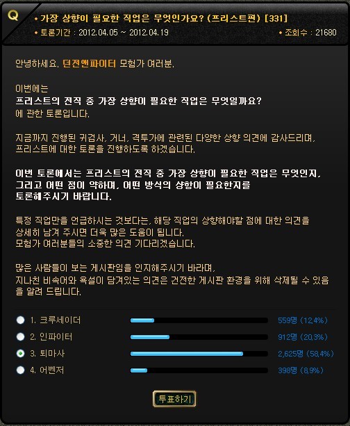 从4/5日开始官网特别发起了大叔系里最需要加强的职业票选,活动截止到4/19,目前驱魔以达到58%的票数居大叔系之首,而居于第二位的蓝拳支持率只有20%。