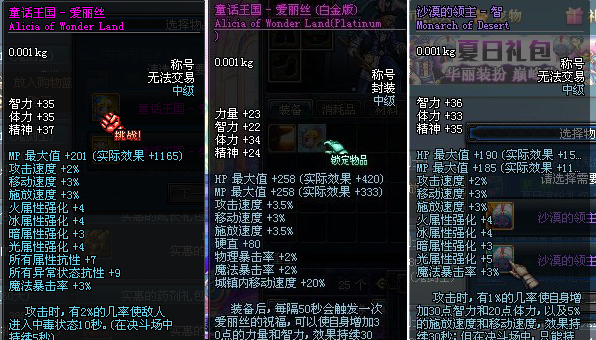 本次只拿268的两个称号中的智力系称号(198的称号惨不忍睹,就不说了)和沙漠领主中的智力系称号做对比,力量系的称号类似。