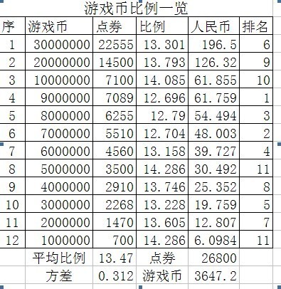由上表,得出平均比例,故购买26800点券,扣去手续费后,共需要3647.2万游戏币,取整为3700万游戏币。