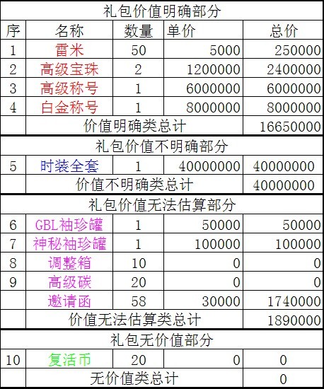 本次分析以广西二区价格为基础,对五一套实际价值作出评价,因本人不愿意影响市场趋势,故在礼包销售结束时才抛出次分析。各大区物价不同,仅作参考。