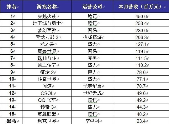 网络游戏单款月收入排行榜 CF & DNF 继续领跑全球