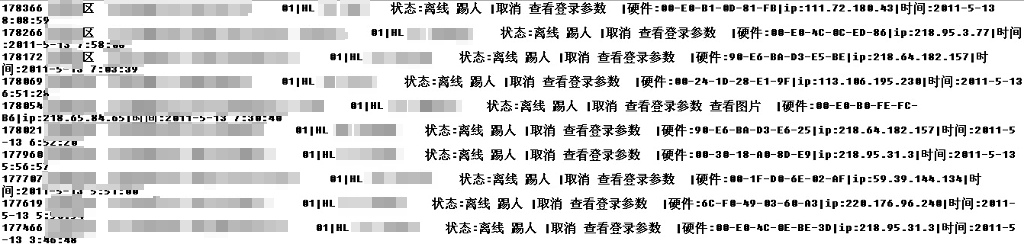 在特别讲一下“黑信”,“黑信”简称“信”,也叫“信封”,一封游戏信封就是包含了某位用户帐号,密码,二级密码,所属游戏大区,主帐号级数,登录参数:MAC地址(或称为MAC位址、硬件地址,用来定义网络设备的位置)、IP地址,首次获取时间,在线状态等,甚至是密保问题的邮件,也可能是一个txt文档,由于获取方式不同,有些信封信息会不尽相同,有登陆密保卡限制的会通过对上面的数字因数进行多次记录,从而破解密保卡,而且有些木马是有截图记录的,密保卡放在电脑的同学要小心了。一般的热门游戏都会有“信封”这种东西,信封是由于上面所说的,电脑被入侵了病毒、木马时,在你登录游戏时,或者在网站输入密保问题时,被木马记录下来,然后发送到盗号者指定的收信地址,现在统一采用ASP空间收信,当然也有发到指定邮箱中的。一般信封是拿来交易的,盗号者不可能花太多时间去上游戏把所有的号全清了,也有的不清号专门卖信封的,这就涉及到“一次信封”和“多次信封”了,一次信封是没有经过清号处理的,多次信封就是经过多次转手清号的,多次信封是别人清完号剩下的给你清,两者价格方面有所不同。有些信封里的帐号会通过帐号的形式转手卖给玩家,也就是卖号。至于你们所说的安全模式问题,上面信封里有首次登录的IP地址,我们相信他记录这东西是有用的,。下面放出信封内容预览图,因涉及帐号隐私安全,我进行加码处理(你说你最讨厌看有码的,那我也没办法),先申明,此资料仅供参考: