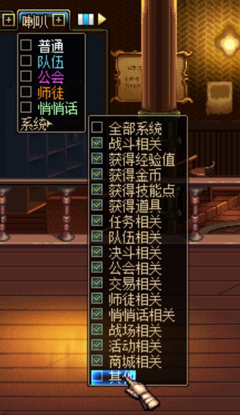 首先我们找到聊天框的喇叭,点击小加号,找到系统,把里面的最后一个选项其他的钩去掉,如图: