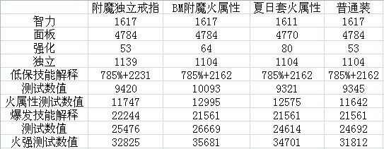 测试物件,夏日火强16项链附魔11火强,BM项链附魔11火强,65假紫项链附魔35独立,65假紫项链没有附魔。佩戴情况下独立和火强的差别我已经在表中标出。