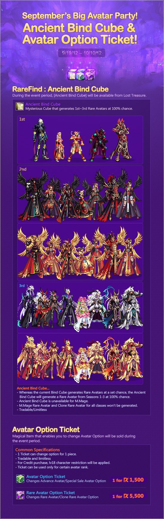 9月19日到10月10日之间,凡使用远古装扮合成器合成装扮,即100%可以合成为美服出现过的天空套之一。同时,开启魔盒(美服称之为Lost treasure)可以获得稀有装扮兑换券,可以兑换天空套装扮。