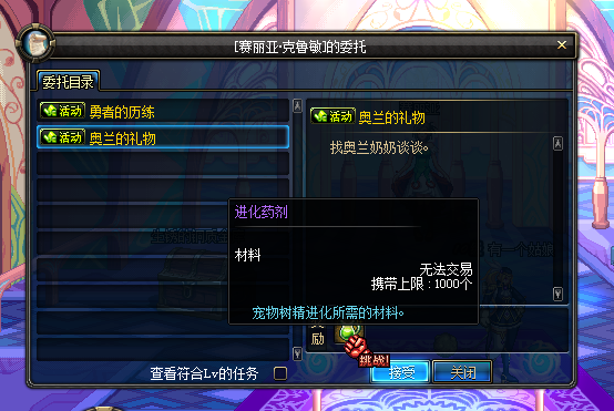 首先奥兰处新增活动任务,对话即可获得1个药剂: