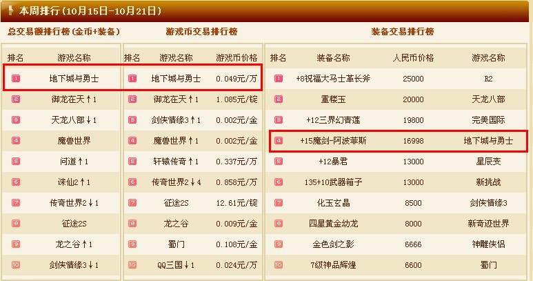 10月15日-10月21日期间,网络游戏交易情况排行榜如图: