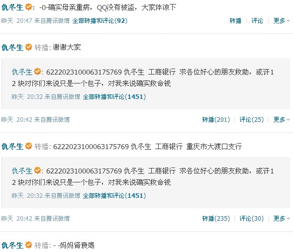 “BUG仇”仇冬生母亲病重 微博求助DNF众玩家