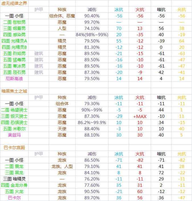 那新异界的怪物们又有怎样的攻击模式和属性抗性呢,下面就发张图给大家看看新的异界三图,异界之逢、巴卡尔宫殿、焦土之城的怪物抗性一览表(仅供参考):
