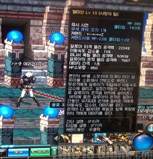 这个技能可能对应红眼的血剑,恶魔猎手会用她的左手召唤魔人之魂扔向目标被击中的目标被魔人之魂附体并减速,顷刻后魔人之魂会爆炸照成大量伤害并在地面上留着痕迹,目标经过或者触碰标记都会受到伤害并触发减速效果。