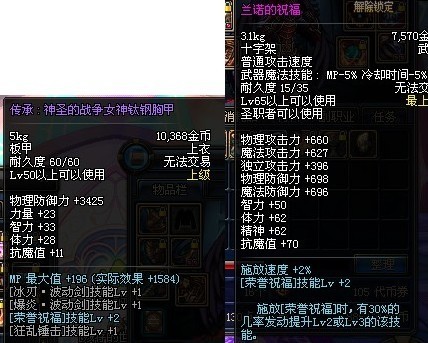同时。相比60粉的燃烧之血十字架和祭祀的祷告。65粉兰诺在抗魔上略有优势。在开荒期金身也要以抗魔为主。当队伍配合熟练且自身抗魔达到一定后。再牺牲抗魔使用燃烧之血十字架等装备提升buff量。