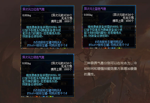 三种异界气息分别可以在攻击力,冷却时间和增强技能效果方面增加装备的属性。