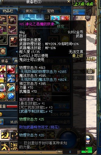 净化之恶魔的奴隶是鬼剑士使用的巨剑,武器的物理攻击力+812,魔法攻击力+595,无视防御的物理和魔法攻击力分别达到了2165和1624,攻击力相当不错!其他属性加成方面,力量+70,抗魔值+70,物理攻击力+45,暴走、死亡抗拒和武器节制技能能及都有提升,另外,巨剑里似乎封印着某种未知的力量,解封之后,说不定会有惊喜哦!