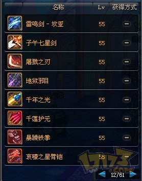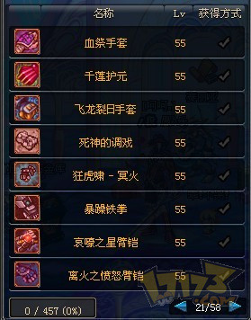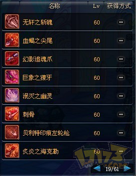 班图的**、冥玉惊魂刀、灵魂伴侣-雷电、血饮红蛇、天脊骨狱息、霜寒之魄、血祭手套、飞龙裂日手套、死神的调戏、狂虎啸-冥火、