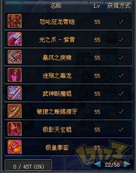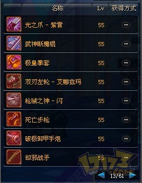 格斗家武器:血祭手套、飞龙裂日手套、死神的调戏、狂虎啸-冥火、离火之愤怒臂铠、怒叱狂龙臂铠、暴风之戾啸、迷殇之毒龙、敏捷之蜥蜴獠牙、极影天玄棍、瞬杀、狂武者之怒