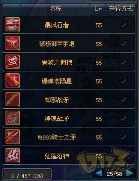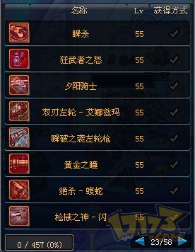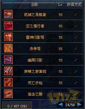 枪手武器:夕阳骑士、瞬破之袭左轮枪、黄金之瞳、绝杀-蝮蛇、机械之导航者、空之猎行者、雷神闪影弩、赤帝弩、幽冥闪影、戾啸之游离铳、阻击之眼、暴风行者、岩浆之拥抱、爆弹双陨星