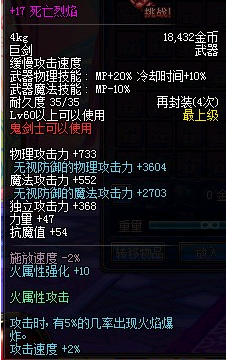 +17死亡烈焰,鬼剑士60粉巨,狂战的极品,60级武器配合17层强化,拥有超高733物攻,无视防御物攻3604,独立攻击368。火强+10配合武器特效,攻击时5%几率触发火焰爆炸,伤害十分可观。造型拉风,属性优异,无论是站街还是刷图都十分的完美。