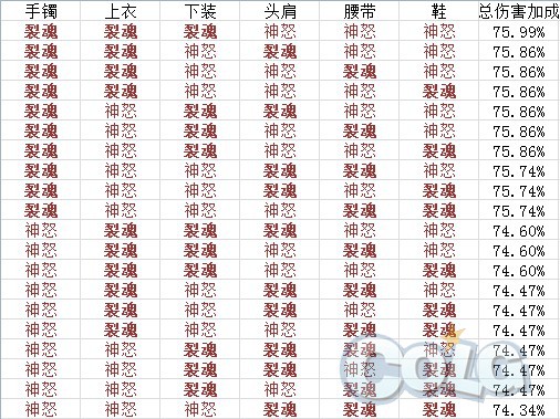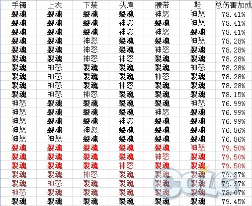 双气息达到3件之后,再把一件神怒替换为裂魂,提升量已经很小了,其中5件裂魂+1件神怒反而比全部是裂魂时伤害还高一点。因此,3件甚至2件其余用神怒就已经够了。