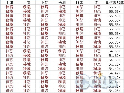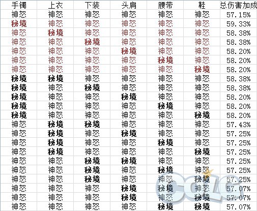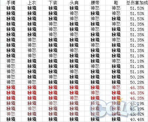 在全套6件神怒的前提下,如果要换一件秘境的话,手镯的提升优于衣、腿,衣、腿优于肩腰鞋