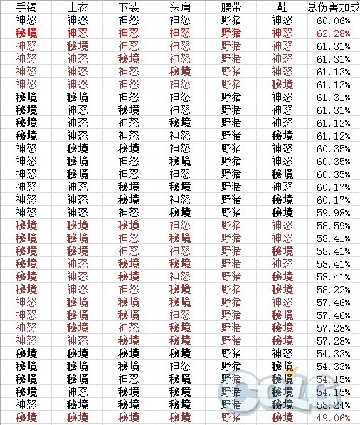 2、全部神怒的伤害加成为57%,远3红绿双气息5件+野猪腰带的伤害加成为82%