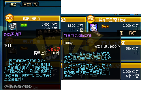 出售跑酷邀请函,下方有无限猫头鹰38块。右边的异界气息清除卷轴可以