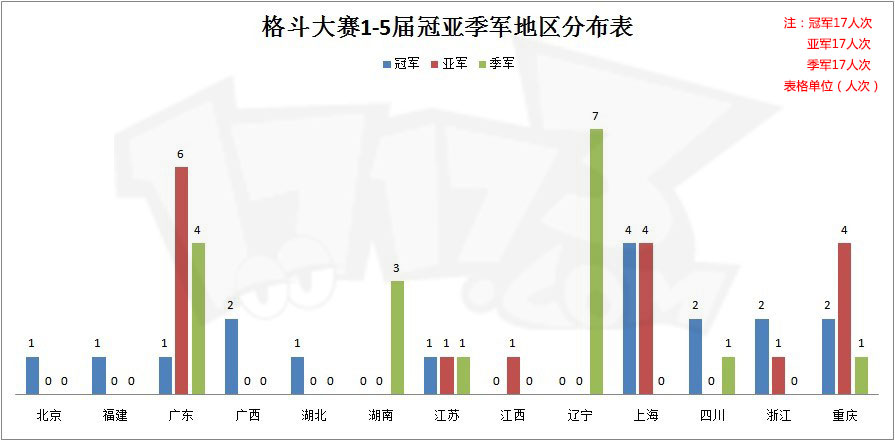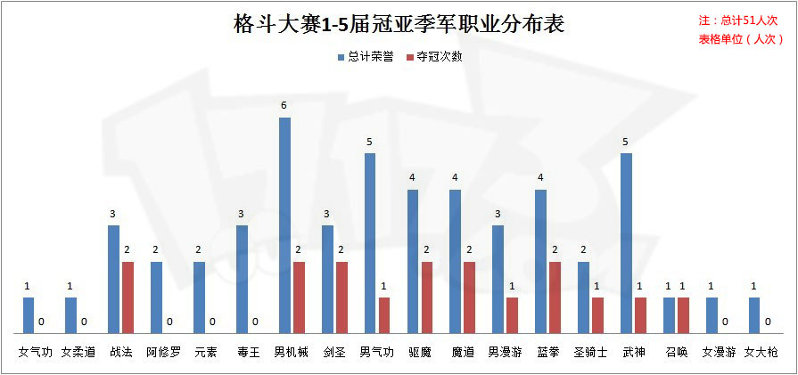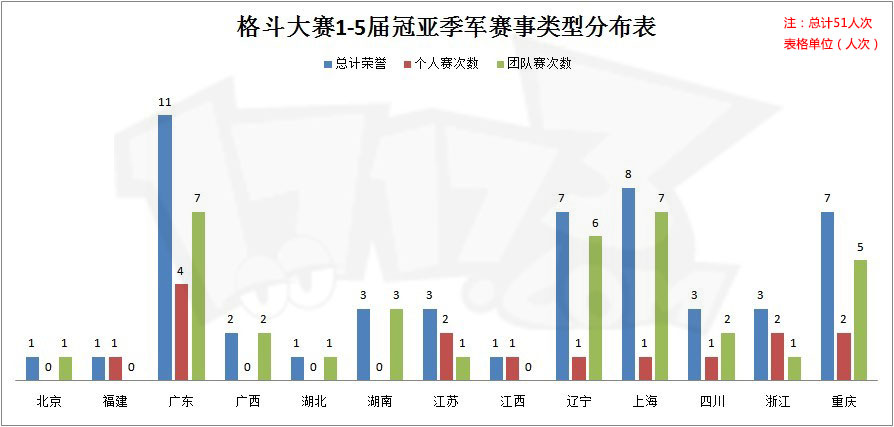 经过统计,从1-5届格斗大赛中一共产生了51人次的三甲荣誉,具体表单如下: