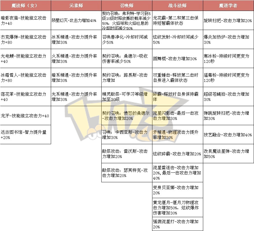 魔法师(女)职业在这次更新中得到了不少提升,先是提高魔法师低级技能,使得其在低级时更容易练级。再者提升了各转职职业的技能,其中力法的受益为全职最高,拥有众多霸体技能的力法刷图完全成了小坦克了....当然元素,召唤,魔道的提升也不小。想知道详细么?那么看下面表格吧
