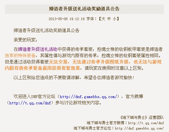 在缔造者升级送礼活动中获得的传承套装:控魂女神的钛钢板甲套装是缔造者独享的特殊装备,其属性值与游戏内原有的传承:控魂女神的钛钢套装属性相同。但是通过活动获得套装无法交易,无法通过传承升级图纸升级,也无法与游戏内原有的传承装备混用获得套装效果,请玩家在使用时注意以上区别。