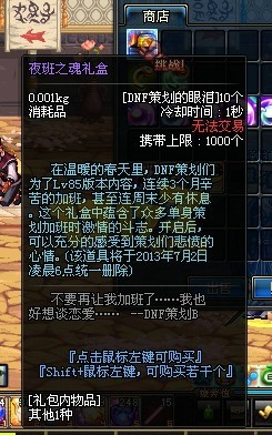 f、新增夜班之魂礼盒(DNF策划的心声?),在各神器购买NPC处使用“DNF策划的眼泪”(材料品)兑换