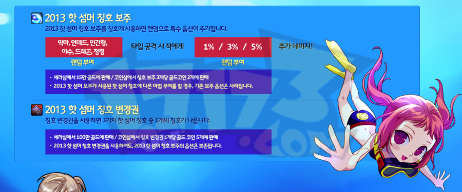 炎炎夏日已经到来,炎热的天气是否让你怀念清凉的海水和美丽的沙滩呢?这次韩服为了各位冒险家也推出了清凉的夏日泳装礼包,2套不同风格的泳装,一套性感成熟的比基尼泳装,一套青涩卖萌的死苦水泳装~而且还有强力的称号的宠物哦。TX你还等什么?还不快快跟韩服同步推出,国服已经很多人摩拳擦掌了,口碑与销量双收的机会就在眼前!