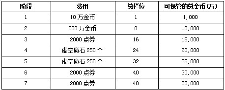 2013年7月16日更新维护后,普通仓库将可以升级到最多152格的空间;由“华丽的金刚石仓库”升级为“泰拉石金库”需要2250点券。