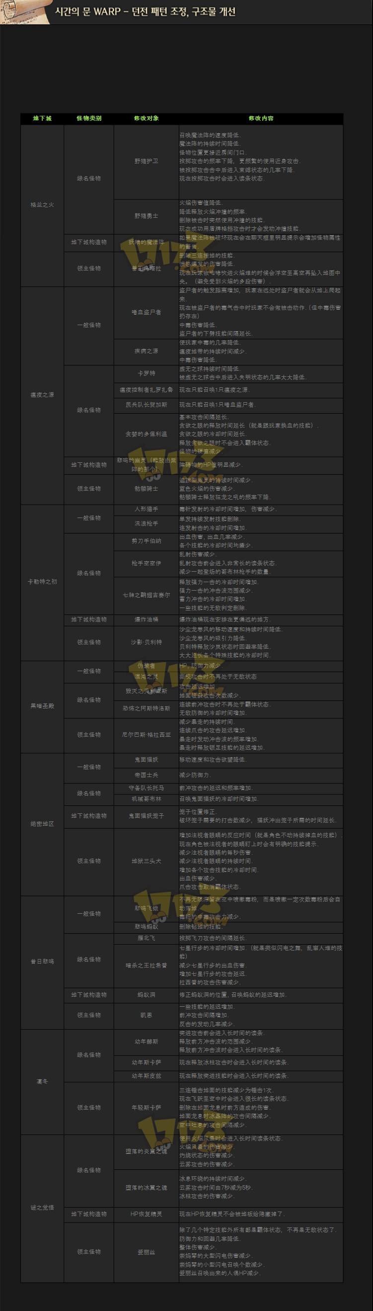 还在为70~85级升级的经验值而望洋兴叹?还在为刷卡勒特之初一样的超级恶心BOSS和绿名怪而烦恼?还在为收集蚂蚁的口水而刷吐了昔日悲鸣?还在为刷陨石找尸体,找不到就双开,三开,四开来燃烧机器?时空之门Warp版本解决你的难题。韩服在3月份进行过的经验值修改,地下城难度修改,任务难度修改,以及陨石获得难度修改让玩家少点恶心,多点便利。游戏性改善了很多。至于国服下次更新极有可能是这个版本。(镇魂真远古和女鬼剑TX的个性会拖很久的)那我们先来预热一下更新内容吧