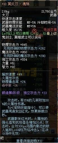 点评:高基础与自带火属性的属性让提升伤害更加容易(堆火强)。同时,几率的附加伤害和自带武器技能也是高级武器中为数不多的亮点,是鬼剑士玩家的不错选择!