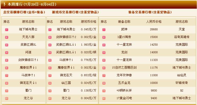 来自第三方交易平台的统计,7月29日-8月4日游戏内交易排行如下,其中DNF第一保持不变。