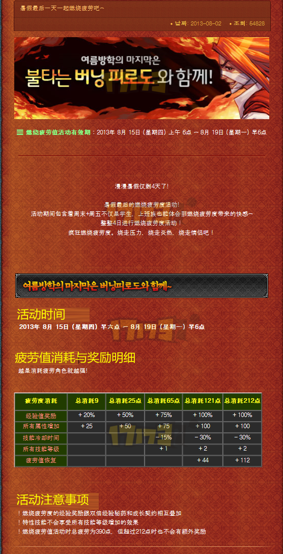 韩国学生们的暑假仅剩4天,韩服从今天开始举行燃烧疲劳度狂欢活动。燃烧疲劳度对小号来说是不错的升级机会,而对满级号来说是不错的竞速机会,因为累计消耗消耗212点疲劳以后角色的所有SP学习技能(包括2觉)都将提升2级的技能等级。所以以往开放燃烧疲劳度活动的时候会有大批一技能秒杀魂远古的视频。比如说狂战士啦,狱血魔神啦,滴血十天什么的...可以趁这个机会一个大蹦,1觉,2觉秒杀魂机械牛...