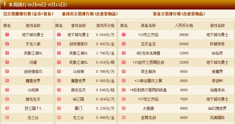 与上周保持相同,DNF总交易额数周来都稳定在第一位,基本无变化。
