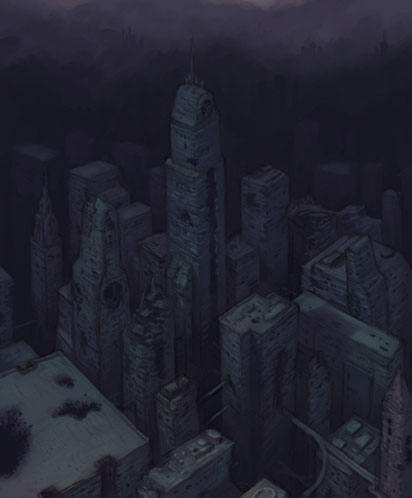 只是与这七色光的美丽相反,它照映出的却是一个丑陋的世界:四处都是倒塌腐坏的建筑,里面有一堆堆东倒西歪的无名尸体,在飞舞的蚊虫中渐渐腐烂。墙壁上乱七八糟的血迹,或许就是那些尸体在这世上留下的最后痕迹。