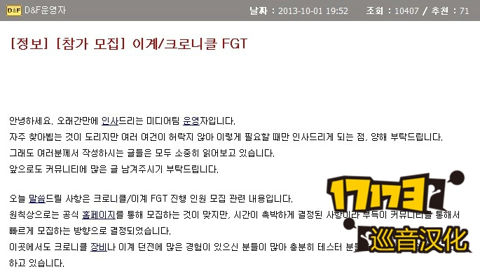 这次NX在10月12日和13日(周六周日)举行大规模FGT,主要招募对象是中高端玩家:一般喜欢在韩服DNF门户网站DF**和daum ruliweb的玩家,并且要求很多满级号和游戏经历(玩的越久越好)。