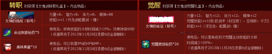 女鬼剑职业在转职或者觉醒时,均可获得好礼!