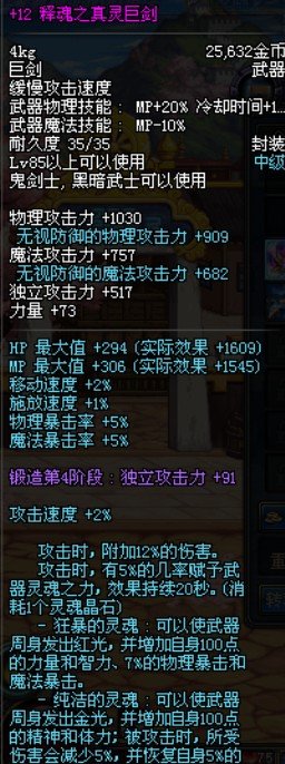 评论:鬼剑士85粉巨,金色刀身,冒着紫色斗气,相当美型,物攻1030,无视909,并增加血蓝上限以及暴击率。武器特效为攻击附带12%额外伤害,并且在攻击时有5%几率消耗一个灵魂石,获得3种BUFF,红BUFF可以增加主属性和暴击,黄BUFF受攻击可以回血,紫BUFF增加10%攻速、施放速度和移动速度,非常炫的一把武器。